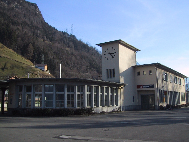 1944 konnte auch das neue Stationsgebäude in Betrieb genommen werden. Das Treppenhaus des Gebäudes ist als Uhrturm ausgebaut. Im Wartsaalannex ist eines der monumentalen Hauptwerke Heinrich Danioths "Föhnwacht" zu bewundern. 1947 kam der Bahnhof als Sujet einer Pro-Patria-Briefmarke zu Ehren.