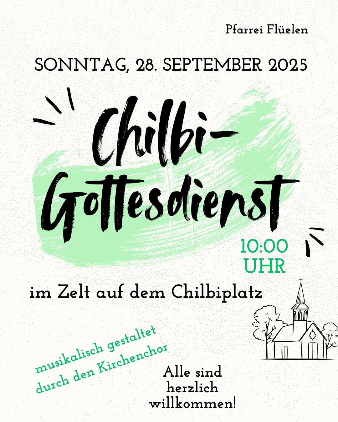 AbgelaufenAm Sonntag, 28. September 2025, findet der Chilbi-Gottesdienst um 10 Uhr im Zelt auf dem Chilbiplatz statt, musikalisch gestaltet durch den Kirchenchor Flüelen.