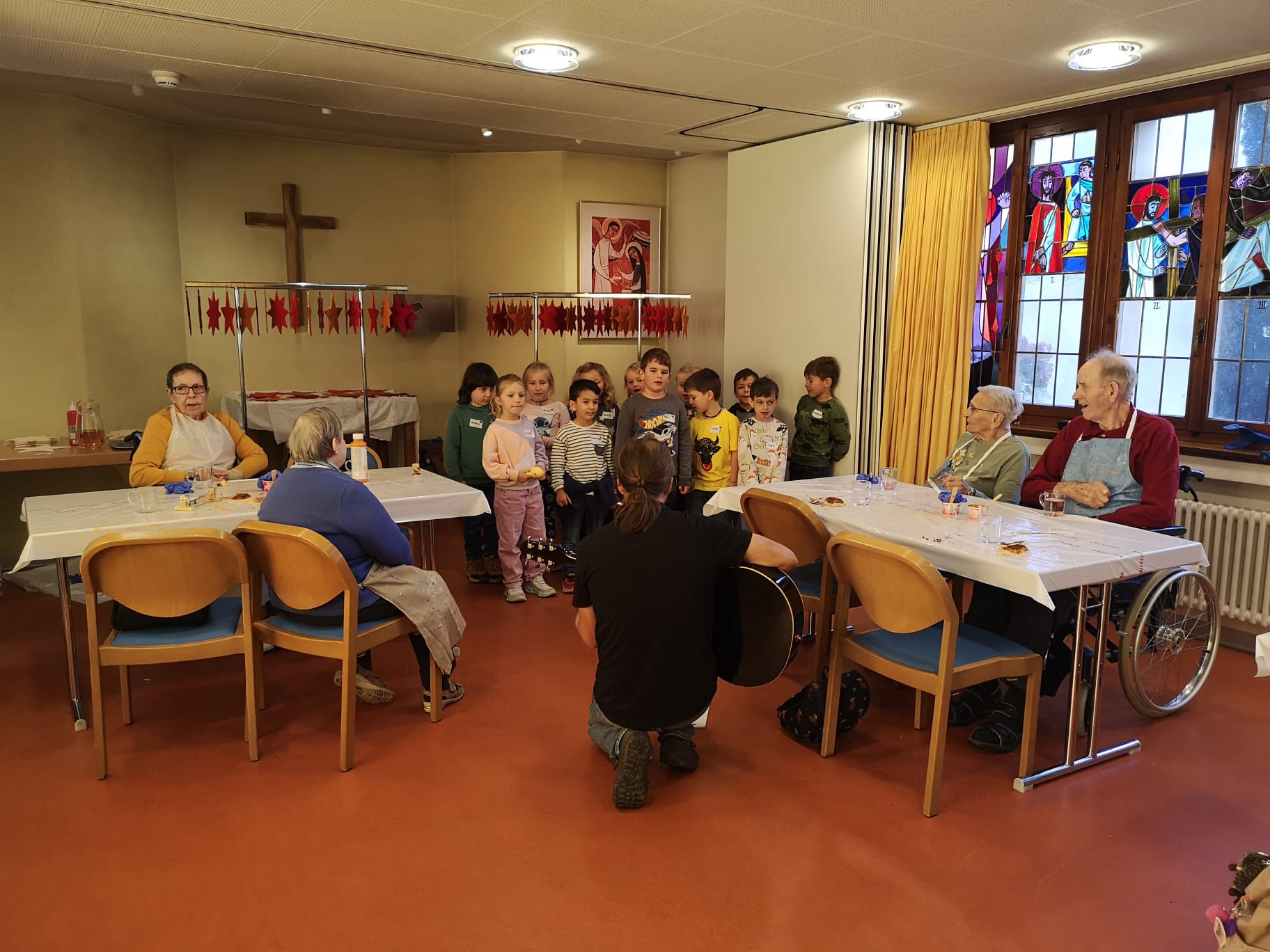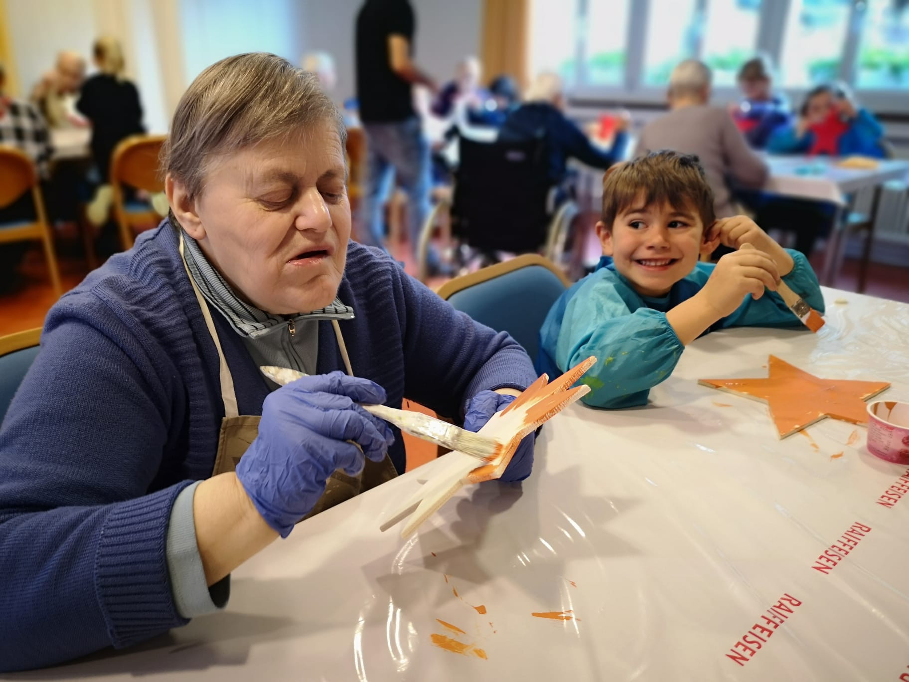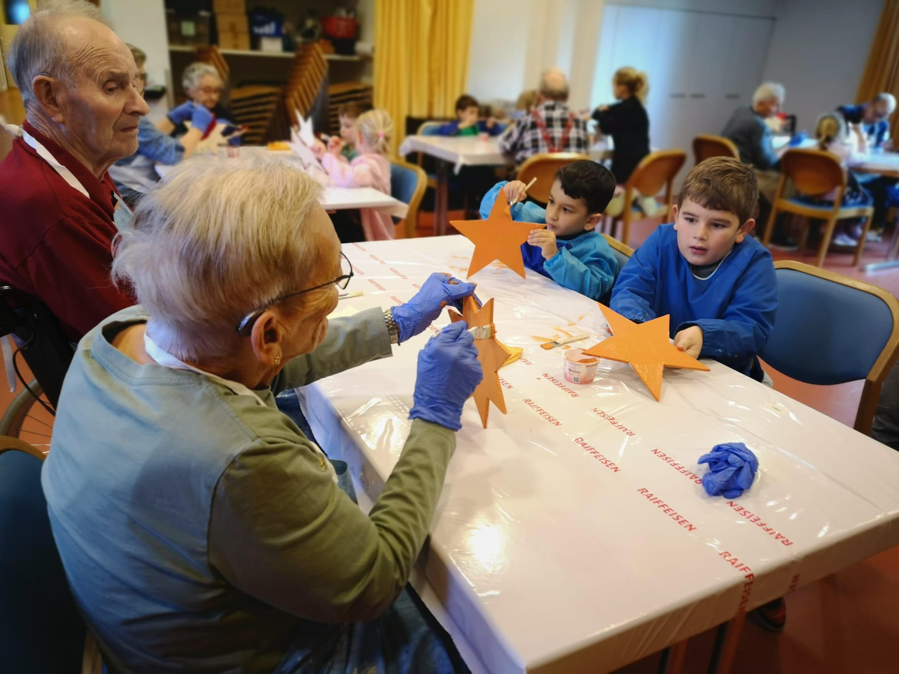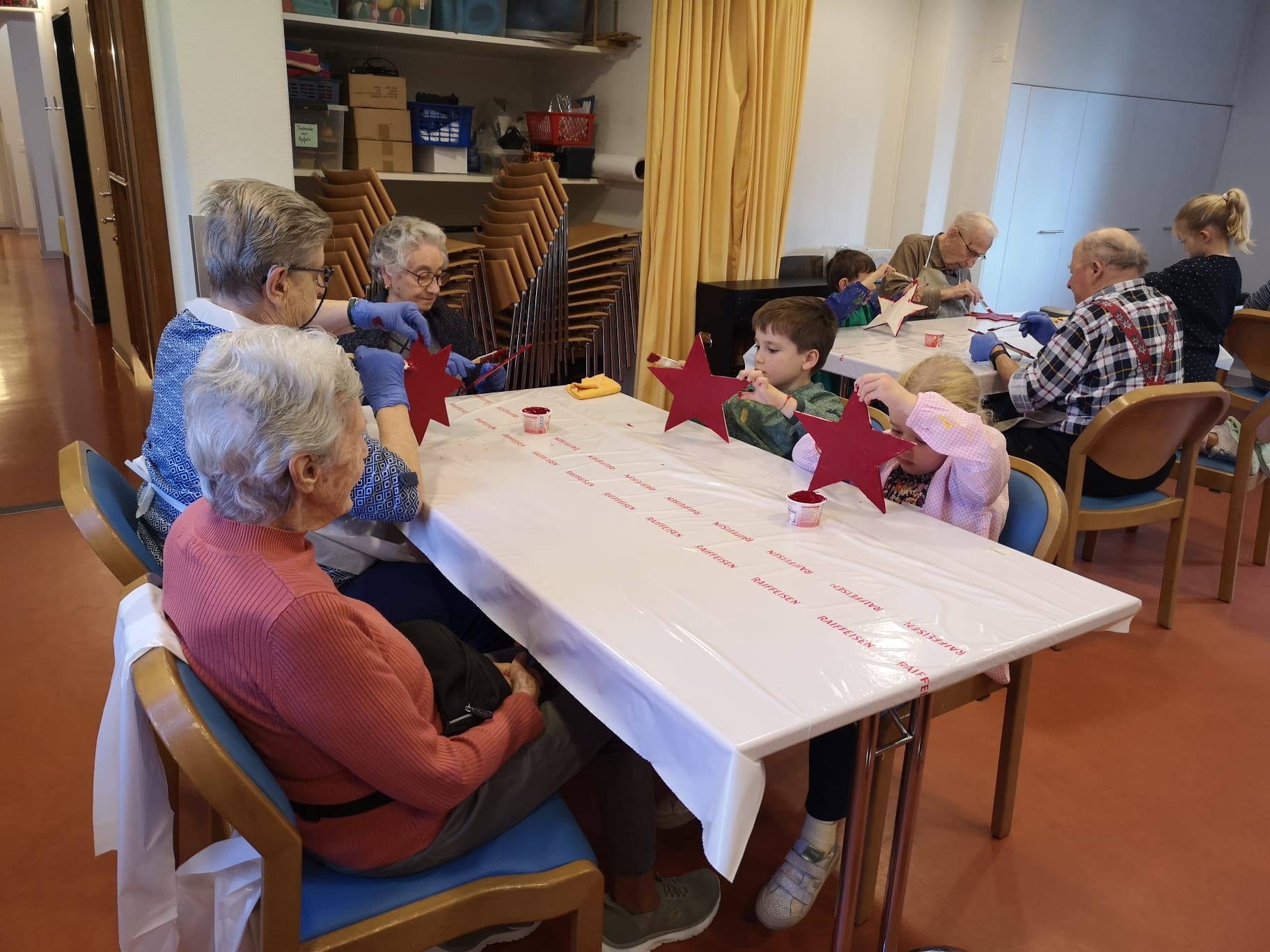 Beim ersten Treffen bemalten wir nach einem kurzen Kennenlernspiel die vorbereiteten Sterne. Beim zweiten Besuch wurden sie dann verziert – es wurde gelacht, erzählt, geholfen aber auch ganz konzentriert gearbeitet. Das dritte und letzte Treffen bildete einen stimmungsvollen Abschluss: Gemeinsam spazierten wir von der Seerose zum geschmückten Weihnachtsbaum der Gemeinde, wo ein kleiner feierlicher Akt stattfand, der das Projekt wunderbar abrundete.