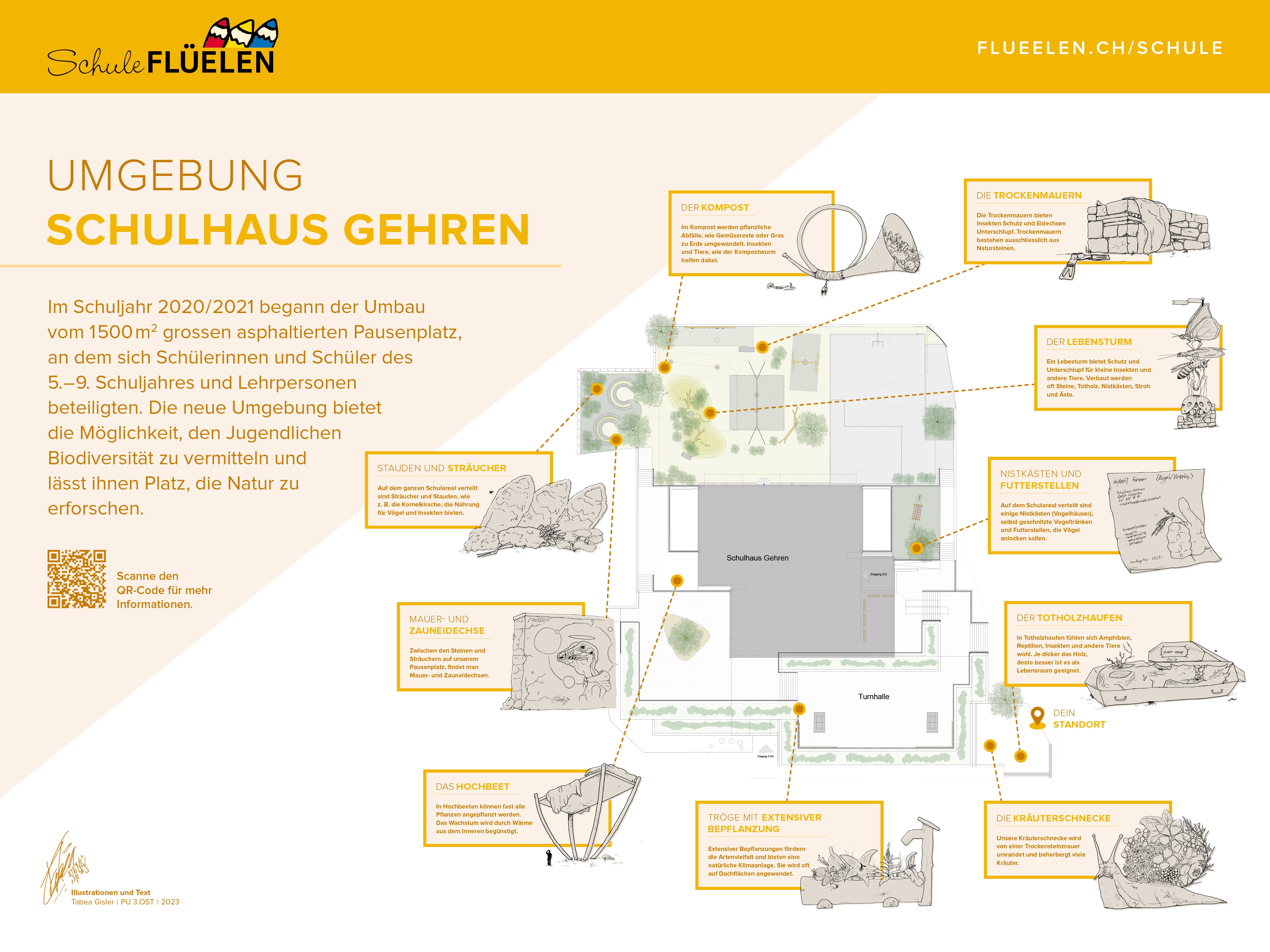 Im Schuljahr 2020/2021 begann der Umbau vom 1500m2 grossen asphaltierten Pausenplatz, an dem sich Schülerinnen und Schüler des 5. - 9. Schuljahres und Lehrpersonen beteiligten. Die neue Umgebung bietet die Möglichkeit, den Jugendlichen Biodiversität zu vermitteln und lässt ihnen Platz, die Natur zu erforschen.
