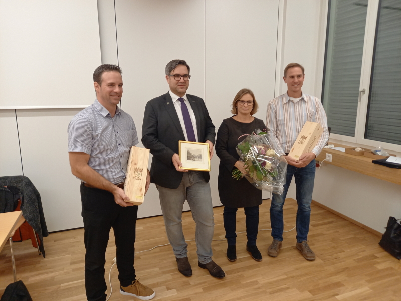 Foto: Verabschiedung verdienter Behördenmitglieder von links nach rechts; Schulratspräsident Mischa Tresch, Gemeindepräsident Remo Baumann, Gemeinderätin Pia Bellmont, Mitglied Baukommission Lukas Eggimann. Auf dem Bild fehlt das ebenfalls abtretende Mitglied der Rechnungsprüfungskommission Patrik Wyrsch